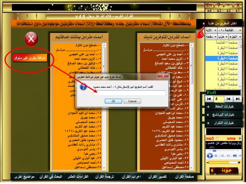 لا يوجد داعي لكل ما تفضلت به فهناك ميزة موجودة في البرنامج بكبسة زر تستطيع إضافة أي مقرئ غير موجود في البرنامج من خلال الصورة الموجودة في المرفقات