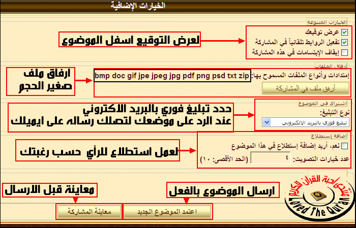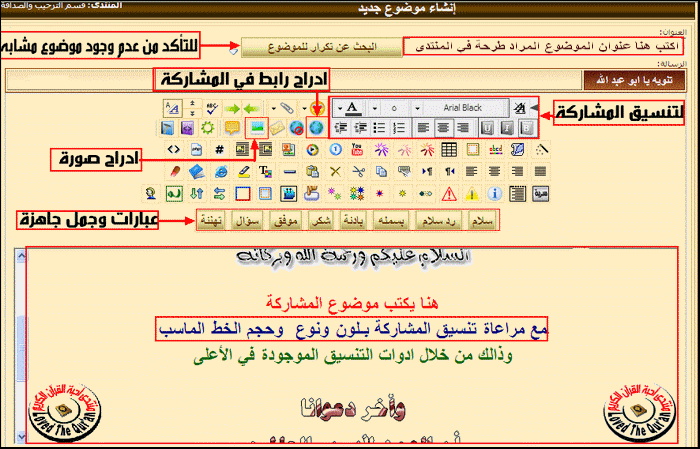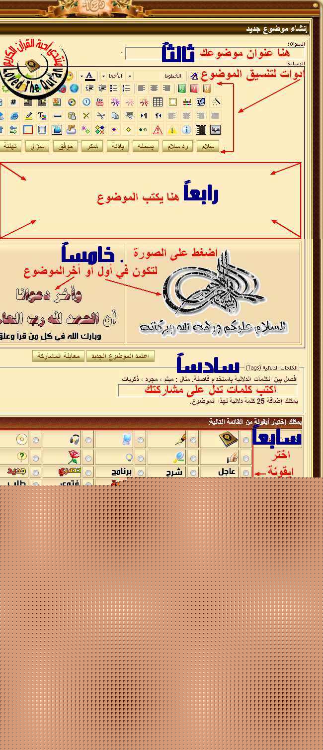 ![]() الحمدلله والصلاة والسلام على رسول الله وعلى آله وصحبه أجمعين اخوانى وأحبتي الاعضاء أعضاء منتدى أحبة القرآن الكريم بارك الله فيكم جميعاً لمروركم الطيب والمبارك الي هذة المشاركة نجدد القاء معكم في موضوع جديد بعنوان طريقة عمل مشاركة (موضوع جديد) في المنتدى بالشكل المناسب والمطلوب اولاً . إختيار القسم المناسب في المنتدى لطرح موضوعك فيه وذالك لسهولة الوصول إليه من قبل الاعضاء والزوار. ثانياً . بعد إختيار القسم المناسب يوجد أعلى كل قسم صورة (موضوع جديد) اضغط عليها.مثال اضغط على (ملتقى الحوار الإسلامي العام) ستشاهد هذه الصورة في أعلى المواضيع اضغط عليها ستفتح صفحة باسم (إنشاء موضوع جديد) ثالثاً . اختيار عنوان مناسب لمشاركتك كما هو موضح في الصورة بالاسفل في حال كانت المشاركة منقوله ارجو التعديل فيها قدر المستطاع لقلمك لمسات سحرية اظهرها هنا كما يجب أن يكون العنوان يدل على محتوى موضوعك الداخلى. ملاحظه/ لتجنب تكرار المواضيع في المنتدى. يمكنك البحث عن موضوع مشابه كما هو موضح بالاسفل رابعاً. أكتب مشاركتك في المكان المناسب كما هو موضح في الصورة بالاسفل مع إستخدام أدوات التنسيق الموجودة (تعرف عليها ) ليزداد موضوعك جمالاً. أنظر الصورة دبل كليك على الصورة للتكبير ![]() شرح طريقةادراج صورة في الموضوع (أوتغيير التوقيع) خامساً . إختيار صور مثل ( ) لتكون في مقدمة المشاركة .كما يوجد صورة ( ) إختر لتكون في نهاية المشاركة.كما هو موضح في الصورة بالأعلى سادساً. الكلمات الدلالية لسهولة الوصول إليها في محركات البحث مثل قوقل يفضل اضافتها لإثراء الموضوع ونشره بصورة أفضل وأوسع كلمات من نفس موضوعك مثل موضوع،برنامج،كلمة،شرح افصل بين كل كلمة والاخرى بفاصلة وذالك من خلال shift+k في لوحة المفاتيح ![]() سابعاً. إختيار أيقونة لمشاركتك ( التي تناسب موضوعك. ثامناً .إختيار عرض توقيعك ليكون اسفل المشاركة وكذالك تفعيل الروابط تلقائيأ كما هوموضح في الصورة ![]() تاسعاً .اختيار نوع التبليغ بعد مشاركة الأعضاء ويفضل (تبليغ فوري بالبريد الالكتروني) لتصلك نص المشاركة على بريدك لالكتروني الخاص فور الرد على الموضوع عاشراً . إذا كانت مشاركتك عبارة عن إستطلاع للرأي علم على الخيار (نعم) كما هو موضح في الصورة أعلاه الحادي عشر .وأخيراً إن شاء الله هو( معاينة المشاركة قبل النشر أو اعتماد الموضوع ليكون في مقدمة عناوين القسم) يوجد هنا شرح لطريقة ادراج صورة في المشاركة صورة توضيحية شاملة جميع النواحي ![]() .. . إنتهى طريقة الاشتراك في قسم كامل من اقسام المنتدى أتمنى من الجميع الإهتمام في الأمور الموضحة أعلاه للحصول على مشاركة منسقة وجميلة تستحق القرأة والردود عليها ايضاً إن شاء الله بارك الله فيكم جميعاً ونلقاكم في موضوع جديد إن شاء الله ![]() اثبت وجودك