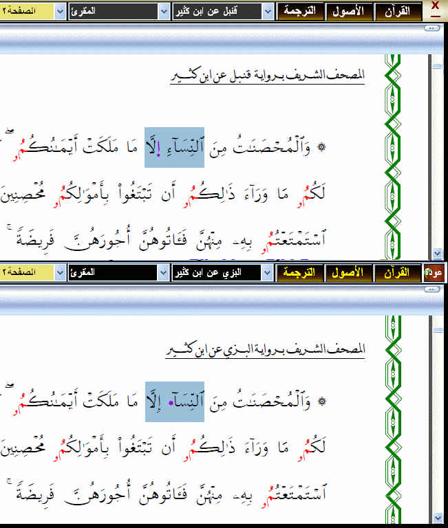البزي عن ابن كثير كامل بالصوت والصورة قنبل عن ابن كثير كامل بالصوت والصورة السلام عليكم ورحمة الله وبركاته الحمدلله والصلاة والسلام على رسول الله وعلى آله وصحبه أجمعين وبعد :- اسعد الله أوقاتكم احبتي في الله نظراً لعدم توفر رواية البزي عن ابن كثير وقنبل عن ابن كثير على الإنتر نت و الوسائل الاخري قمنا بفضل الله عز وجل وبإجتهاد من اخوانكم في ملتقى أحبة القرآن الكريم بفصل الروايتين عن بعض بعدما حصلنا عليها مد مجة في قراءة واحدة للشيخ الفاضل محمد عبد الحكيم **الفصل قدر الاستطاعة وبفضلاً من الله عز وجل تم إيجاد ما يعادل 150 إلى 170 إختلاف بين رواية البزي وقنبل عن ابن كثير ممثل في 148 صفحة تم تميزهم وفصلهم عن بعض مثال لو قمنا بالأستماع الآية رقم24 من الصفحة رقم 82 من قراءة البزي وقنبل عن ابن كثير معاً لوجدنا ان الاية الكريمه تقرأ ((وَالْمُحْصَنَاتُ مِنَ النِّسَاءِ إِلاَّ مَا مَلَكَتْ أَيْمَانُكُمْ ۖ كِتَابَ اللّهِ عَلَيْكُمْ ۚ وَأُحِلَّ لَكُم مَّا وَرَاءَ ذَلِكُمْ أَن تَبْتَغُواْ بِأَمْوَالِكُم مُّحْصِنِينَ غَيْرَ مُسَافِحِينَ ۚ فَمَا اسْتَمْتَعْتُم بِهِ مِنْهُنَّ فَآتُوهُنَّ أُجُورَهُنَّ فَرِيضَةً ۚ وَلاَ جُنَاحَ عَلَيْكُمْ فِيمَا تَرَاضَيْتُم بِهِ مِن بَعْدِ الْفَرِيضَةِ ۚ إِنَّ اللّهَ كَانَ عَلِيماً حَكِيماً (24))) أو كما في هو موضح في نمودج مقارنة التلاوات الموجود في برنامج كلام الله عز وجل التحديث الاخير v.4.4 كما في الصورة ![]() في هذا الموضع همزتان متفقتان من كلمتين نجد في التلاوة المشتركة ( النِّسَاءِ إِلاَّ) تقرأ أولاً برواية البزي عن ابن كثير ثم يقف المقرئ ويعيد تلاوتها برواية قنبل عن ابن كثير استمع من هنـــا ففي رواية قنبل عن ابن كثير ((((يسهل الهمزة الثانية أو يبدلها حرف مد من جنس حركة ما قبلها)))) استمع من هنـــا أما في رواية البزي عن ابن كثير (((( يسقط الهمزة الأولى مع المد والقصر)))) استمع من هنـــا **ما قمنا به هو فصل الروايتين عن بعض وجمع الاختلافات الموجودة بين الايات وإضافتها في في مجلد منفصل **في ملفات رواية البزي عن ابن كثير لا نسمع اعادة الايه الكريمة برواية قنبل مرة اخرى نسمعها فقط برواية البزي عن ابن كثير وهكذا في ملفات رواية قنبل عن ابن كثير لا نسمع قبلها التلاوة برواية البزي عن ابن كثير **وبفضل من الله عز وجل اجتهدنا قدر استطاعتنا وتحققنا من الامر مع مراجعة الاختلافات اكثر من مرة فما كان صوابأ فبتوفيق من الله وما كان خطأ فمن نفسي ومن الشيطان (ربنا لا تؤاخذنا إن نسينا أو أخطأنا) \\=o=// تنبيه هام جداً \\=o=// بعد ان قمنا برفع اكثر من ملف وجدنا ان هناك اختلافات اخرى في الايات فقمنا بفصلها واعادة رفعها مرة اخرى فأرجو من كل من قام بتحميل الملفات قبل تاريخ 02.02.2012 من قام بتحميل رواية البزي وقنبل عن ابن كثير معاً اعادة تحميل الملف الثالث فقط من هنا يرجى تحديث الصفحة بعد فتها ومن قام بتحميل الملفات الثلاثه لرواية قنبل عن ابن كثير اعادة تحميل الملفات الثلاثه جميعها من هنا يرجى تحديث الصفحة بعد فتها ومن قام بتحميل الملفات الثلاثه لرواية البزي عن ابن كثير اعادة تحميل الملفات الثلاثه جميعها من هنا يرجى تحديث الصفحة بعد فتها والله الموفق هذا وبارك الله فيكم وجزاكم الله عنا خير الجزاء وارجو ابلاغنا عن اي خلل والسلام عليكم ورحمة الله وبركاته ![]() اثبت وجودك