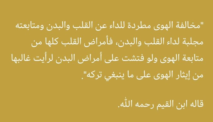 ![]() "ﺃﺻﻞ اﻟﻌﺪاﻭﺓ ﻭاﻟﺸﺮ ﻭاﻟﺤﺴﺪ اﻟﻮاﻗﻊ ﺑﻴﻦ اﻟﻨﺎﺱ ﻣﻦ اﺗﺒﺎﻉ اﻟﻬﻮﻯ ﻓﻤﻦ ﺧﺎﻟﻒ ﻫﻮاﻩ ﺃﺭاﺡ ﻗﻠﺒﻪ ﻭﺑﺪﻧﻪ ﻭﺟﻮاﺭﺣﻪ ﻓﺎﺳﺘﺮاﺡ ﻭﺃﺭاﺡ".